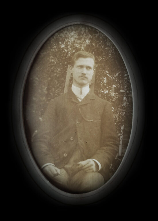 En août 2025, je reçois le généreux message mail d’un – érudit – généalogiste, historien et conférencier, Philippe Bonneu-Faure de Neuvialhe. Il y évoque les relations d’amitiés entre sa famille, originaire du Lot-et-Garonne, et Raoul & Bertrand. Le classement d’archives familiales, en voie d’une numérisation par les Archives départementales, l’on amené à découvrir ce cliché unique de Bertrand, ainsi que deux aquarelles représentant la maison familiale de Bernède.