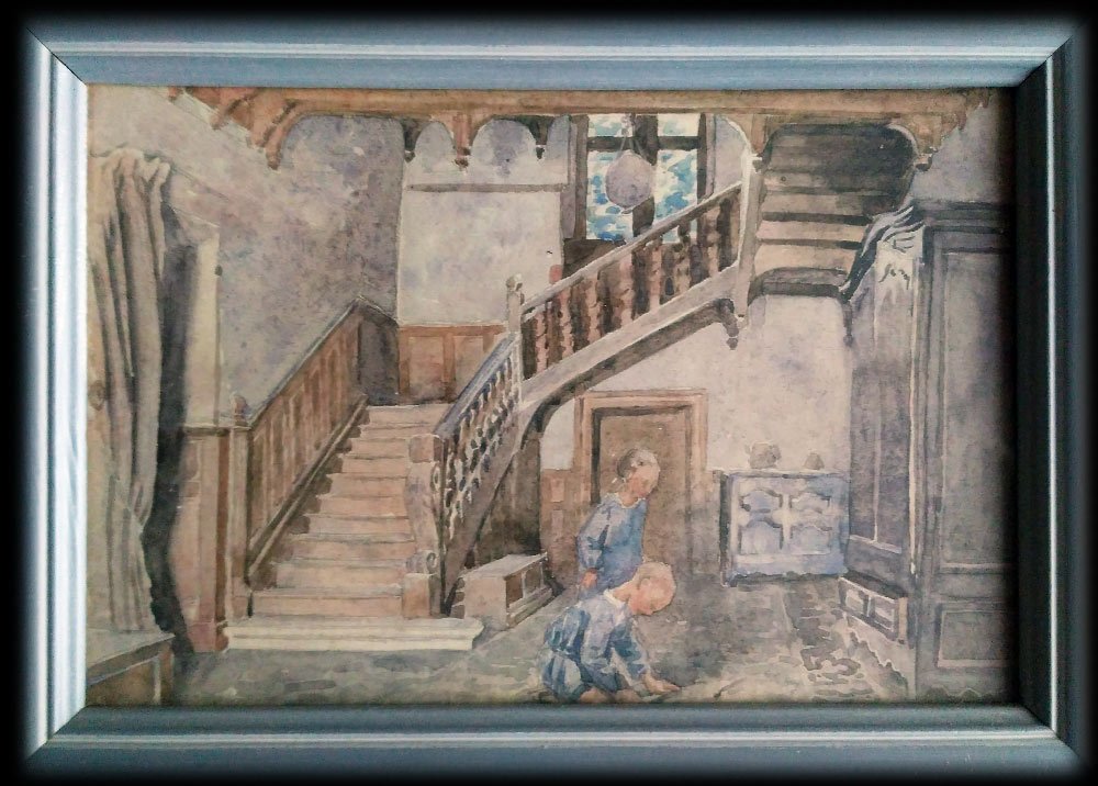 « Nous possédons également deux petites aquarelles peinte par Bertrand montrant l’extérieur de notre maison familiale « Bernède » au dessus de Valence d’Agen et le vestibule où mon grand-père et son frère enfant jouent au pied de l’escalier d’honneur. »